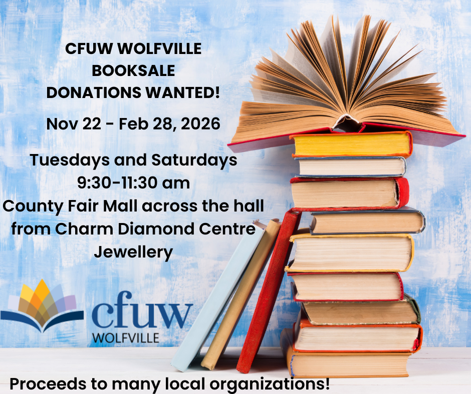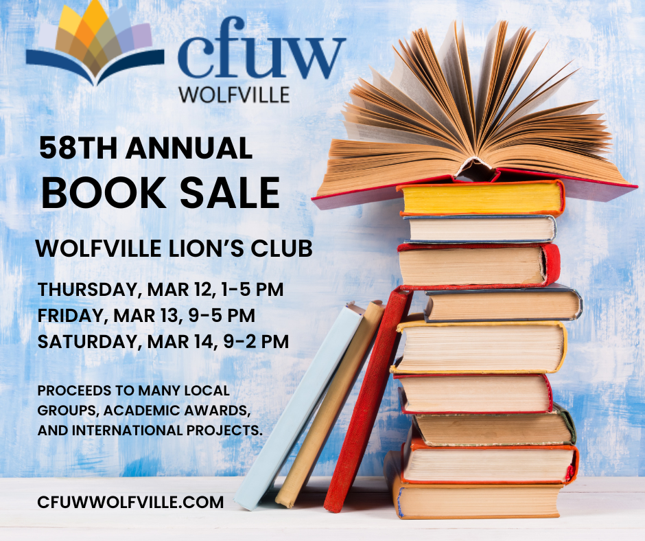 CFUW Wolfville’s monthly programs and guest speakers educate, inform and entertain members. Most presentations are open to the public. Check the local papers or cfuwwolfville.com and join us for an evening out! Click on the “Read More” button to get to our live book sale link: cfuwwolfville.com/booksale/
